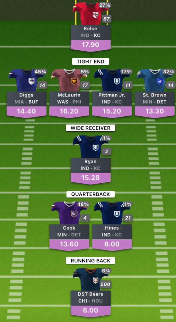 The Colts stack line-up fared a bit better overall. But again the injury bug struck at RB with Dalvin Cook going out with a shoulder injury after playing well against the Lions.