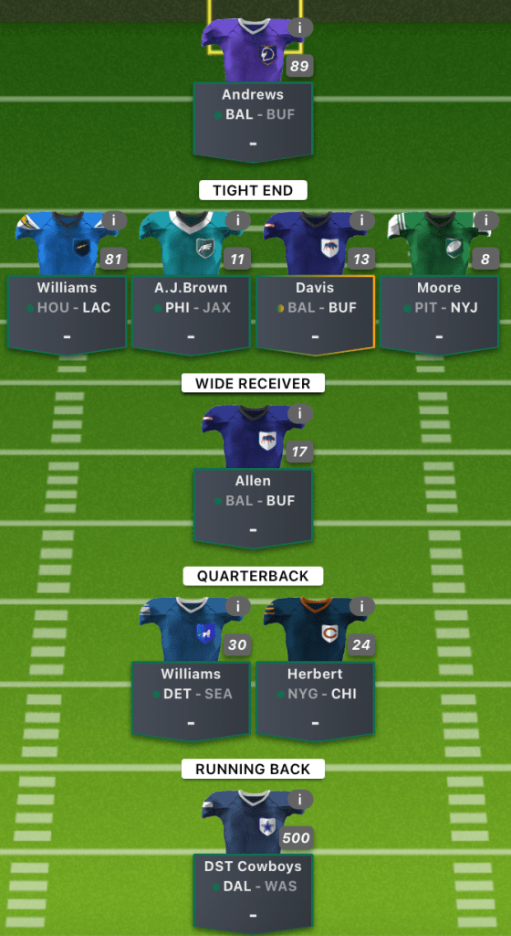For my final receiver, I have opted for Elijah Moore. Joe Flacco has locked in on Garret Wilson and Conklin to the start the season, but this week Zach Wilson returns at QB. Over the back half of last season Moore was one of the top WRs in the NFL with Wilson throwing him the ball.