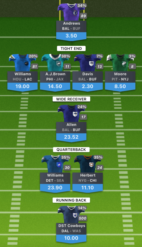 We targeted the Bills @ Ravens game as one with shoot-out potential. Unfortunately, it was a tale of two halves with with the Ravens having a strong first half, before the Bills fought back in the second half to seal a last second win.