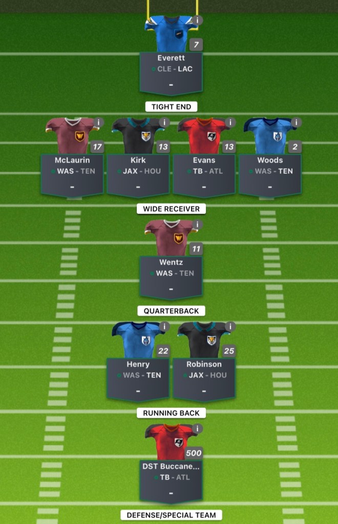 On the other side of the game I’ve taken both Robert Woods and Derrick Henry. Woods is the clear number one receiver for the Titans this week with Treylon Burks being injured. Henry had a slow start to the season but is starting to look like his old self again and should see plenty of opportunities against the Commanders.