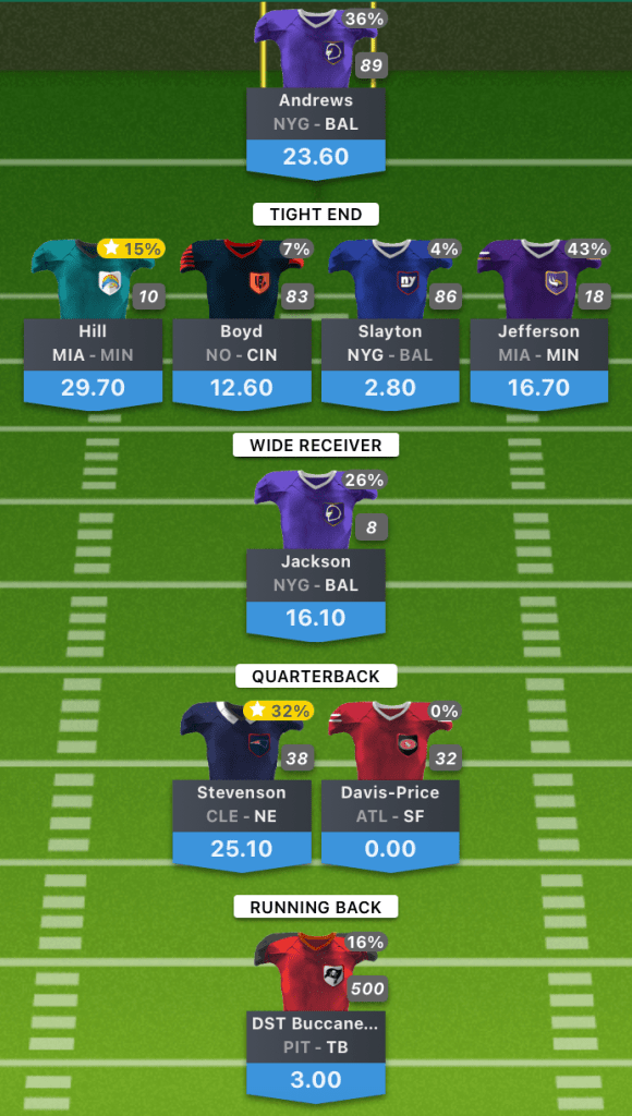 My two stud receivers had mixed performances. Tyreek Hill had a monster game with a mixture of Skylar Thompson and Teddy Bridgewater at QB. Kirk Cousins had a slow day with 175 yards a 2 TDs, Justin Jefferson managed to get over half of the yards but unfortunately the TDs went another way.