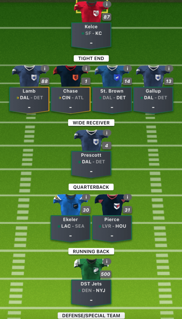 I’ve made use of my savings to pick up top tier options at Running Back, Wide Receiver and Tight End. First off, I have Travis Kelce at tight end. Despite turning 33 this month, Kelce shows no signs of slowing down. The 49ers have been defending tight ends well, but Kelce is as close to match-up proof as they come.