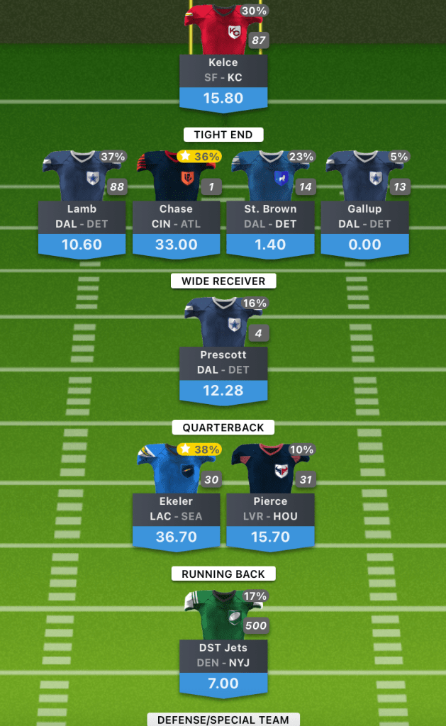 I went for a high risk – high reward stack with the Dallas Cowboys, the stack didn’t pay off but I like the strategy and you can see how it can pay off with Chase and Ekeler having monster games. We’ll go again next week, and hopefully earn a first cash!