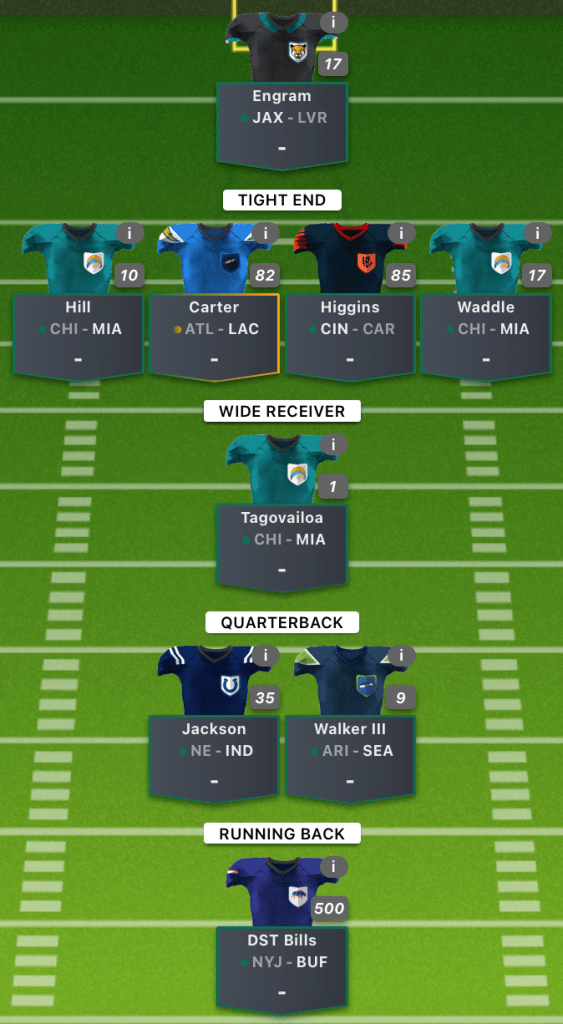 I’ve paired him with both his top Wide Receivers in Tyreek Hill and Jalen Waddle. Hill and Waddle are the clear top two options for Tua and have playing amazingly this season. It doesn’t matter who he defence tries to take away, they are both excelling in double coverage!