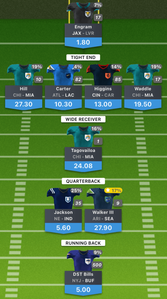 The Miami Dolphins stack put up a pretty decent set of scores this week. Tua Tagovailoa threw three touchdowns in a close fought victory against the Chicago Bears.