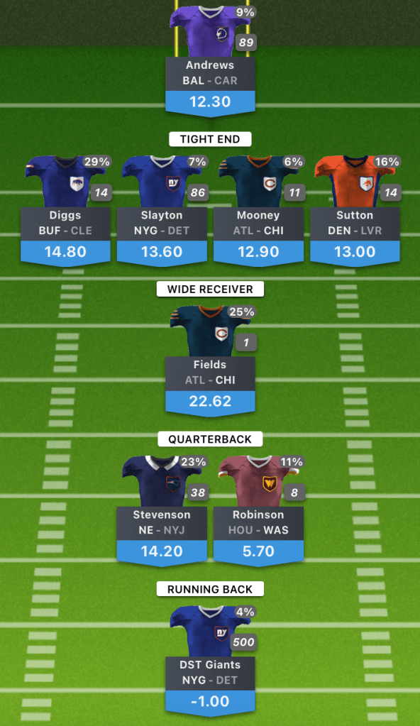 I started the line-up off with a bet on Justin Fields continuing the great form he’s shown in weeks 9 and 10. The Atlanta defence has been pretty awful this season, so it seemed a good bet. I paired him with his WR1, Darnell Mooney, who has the speed to be a threat to score on any play.
