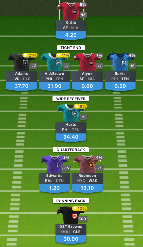 It’s interesting to compare the composition of the two teams. When we had success in week 13 we did have some players with high ownership but bar Davante Adams they were all at 13% or below. This gives us a better chance at a unique roster and a chance to win overall.
