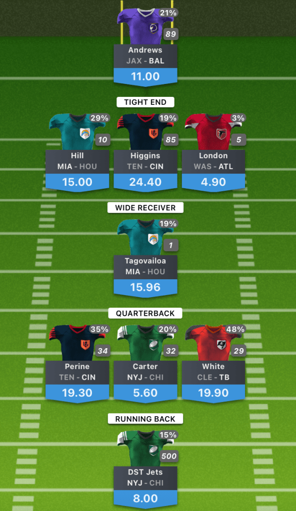 Week 12’s line-up was a lot less impressive than this weeks entry. We had some solid scores from a lot of the line-up including Higgins, Perine and White, but we had no players that made the dream team for the week.