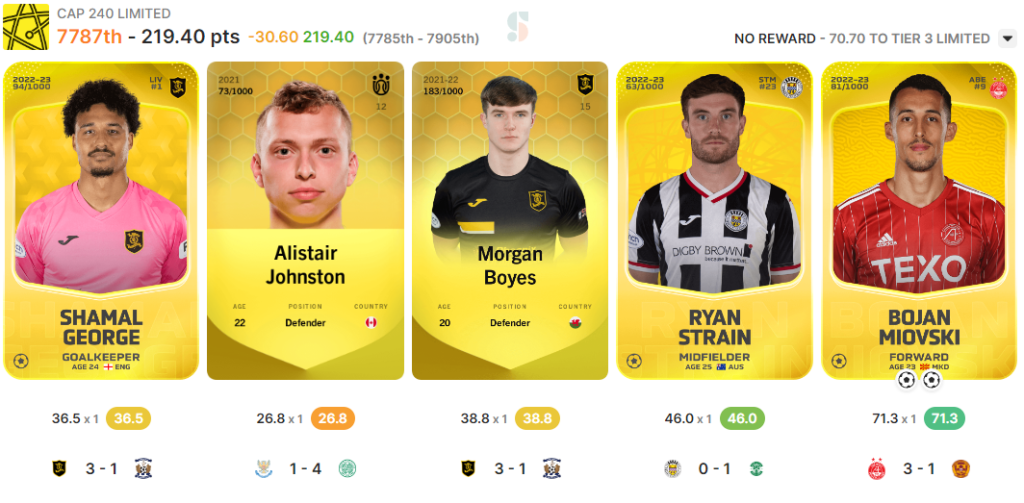 I fell short of the threshold in Gameweek #343 and again performed better in Cap 220 than 240 (no rewards earned in either sadly). Starting off with what went right, Bojan Miovski had a great game scoring 2 goals for Aberdeen. Strain and Boyes both had reasonable performances, coming in right around their L15 averages.