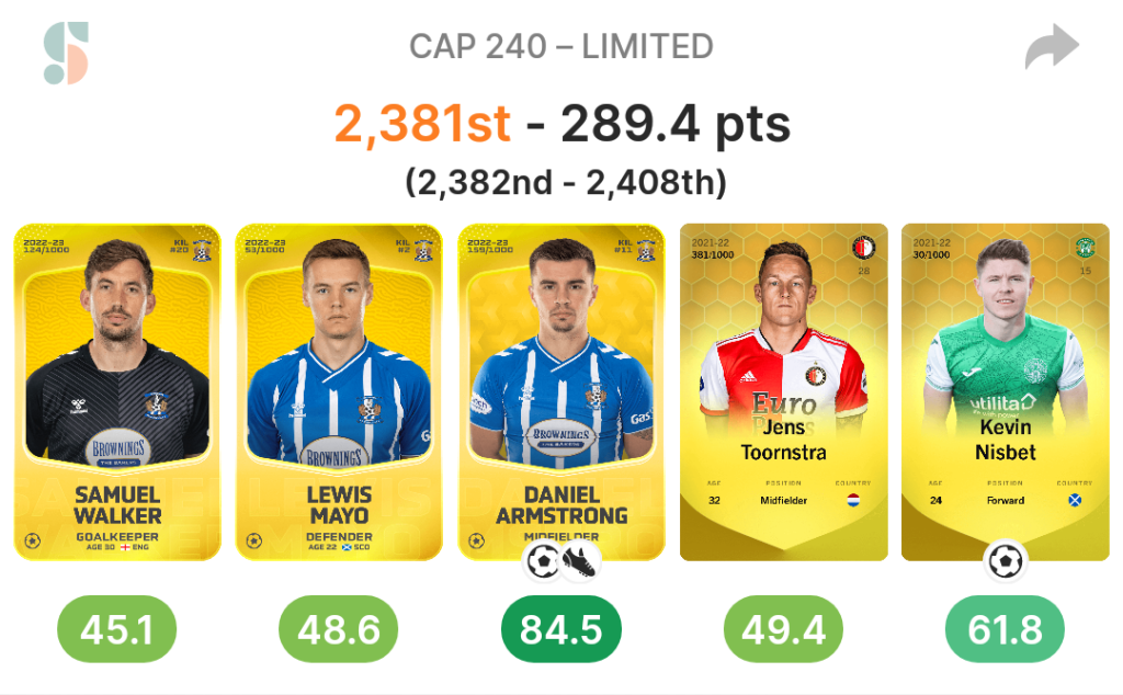 Danny Armstrong was clearly the star of the show. He scored one and created another to record an excellent 84.5 points. Kilmarnock didn’t manage the clean sheet against Hearts, but his teammates Samuel Walker and Lewis Mayo both put up respectable scores.