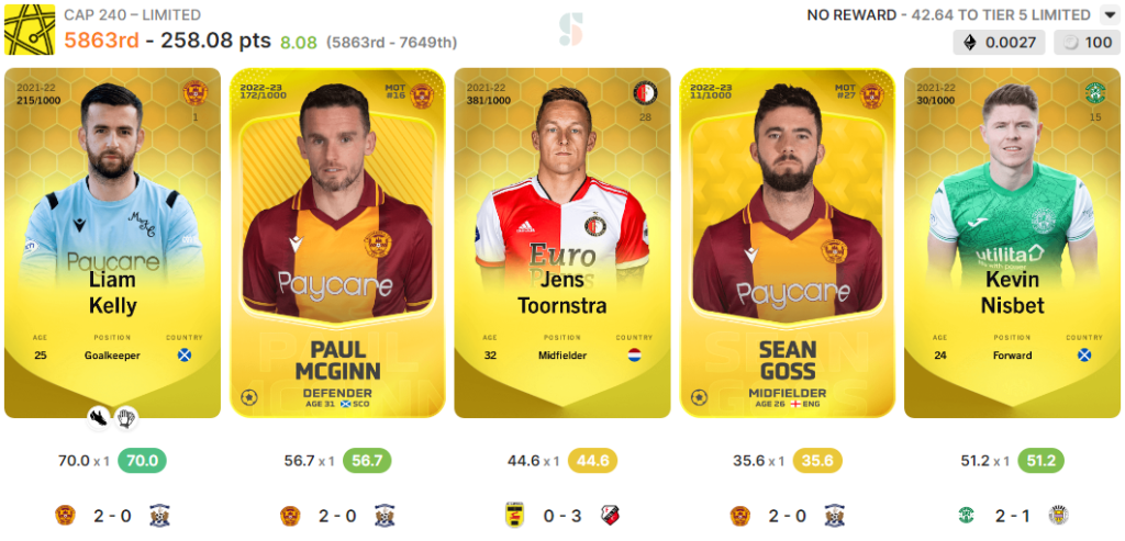Joining him is Rangers-loanee, Lewis Mayo, in defence and Danny Armstrong in midfield. Mayo has done really well on Sorare during his loan spell, especially when Killie are at home. As mentioned above. I’m a big fan of Armstrong at home so he was a no brainer!