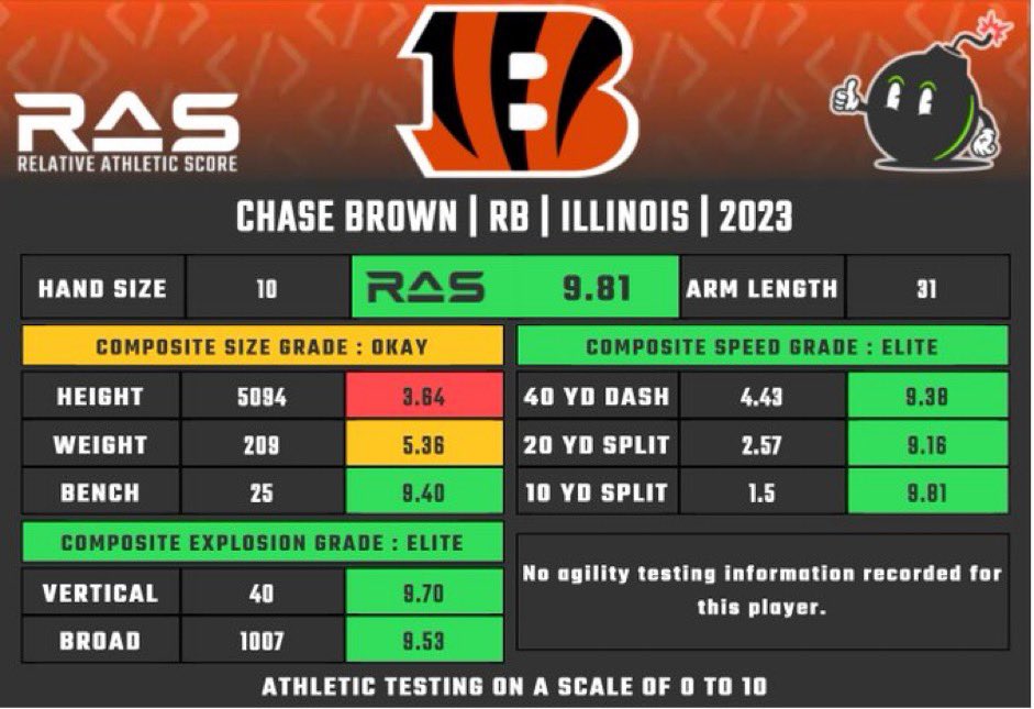 Brown was invited to the scouting combine and tested very well. He lead all running backs in the vertical and broad jumps as well as coming 4th among RBs in the 40-yard dash. He didn’t do the agility testing, so we don’t have anything to go on there.