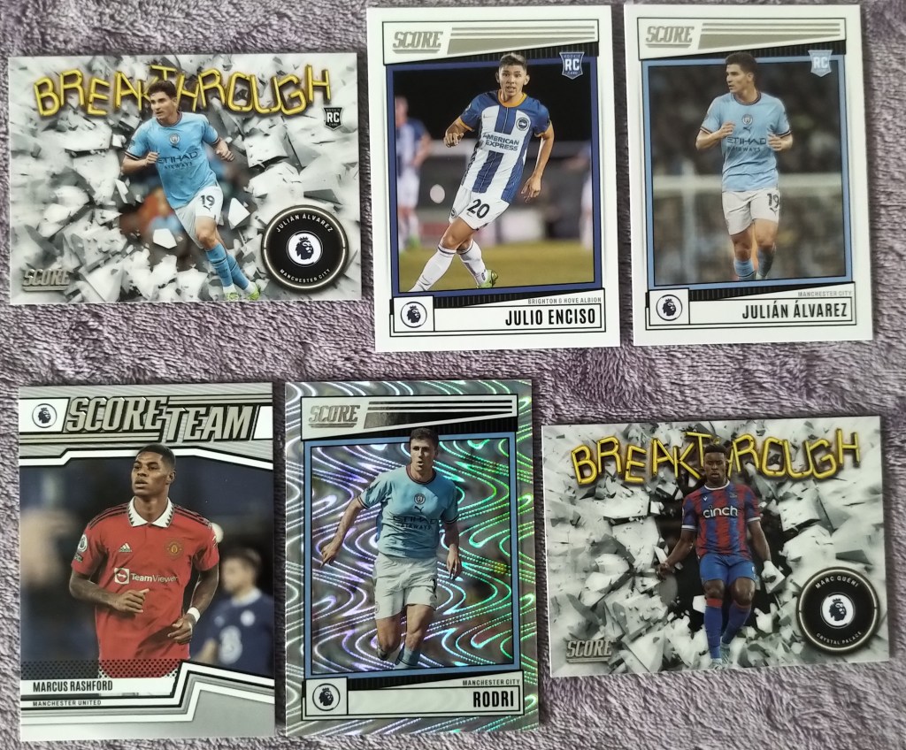 There was a bunch of other cool cards across the packs including base rookie cards for a couple of South American forwards, Brighton’s Julio Enciso and Manchester City’s Julian Alvarez. I also found a non-numbered Rodri silver swirl parallel. Plus some fun inserts including a nice Marcus Rashford ‘Score Team’ card and ‘Breakthrough’ cards for Marc Guehi and Julian Alvarez.