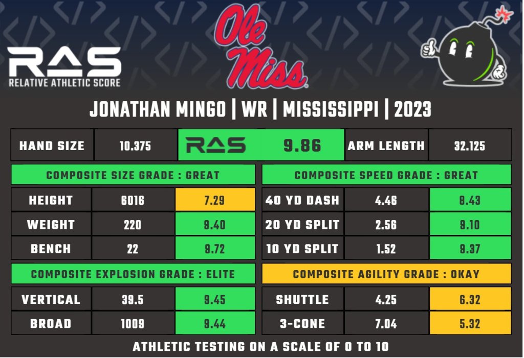 The Relative Athletic Score metric from @mathbomb on Twitter ranks a player against every player to test at the combine in his position since 1987. Overall, Mingo scored an excellent 9.86 out of 10 indicating less than 2% of receivers have tested better than him in the last 3 and a half decades. In fact he was one of the top 10 RAS performers at this years Combine across all positions.