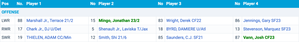 Mingo joins a Panthers receiving room that has plenty of depth. However, there’s no-one you’d have as a true number one receiver after DJ Moore was traded to Chicago. Terrence Marshall Jr flashed last season as a big play threat catching 28 for 490 yards and 1 touchdown, but it’s a big step for him to become the top target in an offence.