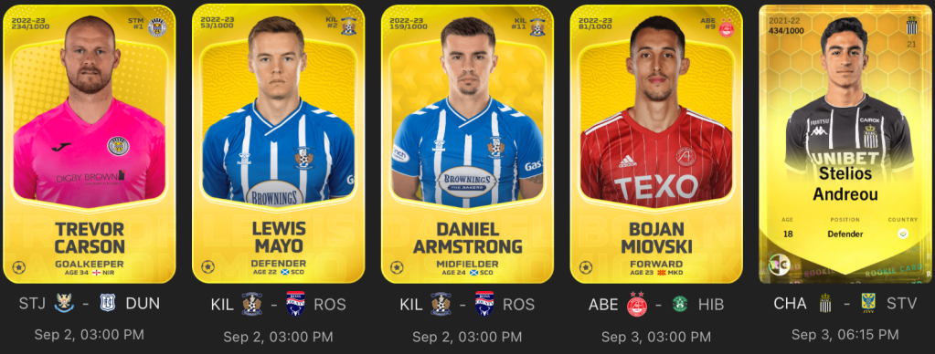 Daniel Armstrong*, Kilmarnock – Armstrong is one of my favourite capped mode midfielders and a no brainer addition to the column this week. Armstrong remains the star player for Kilmarnock and is involved in just about everything going forward. Most importantly for Sorare scoring, he also takes the majority of set pieces for Killie. Armstrong has started the season in pretty decent form setting up a goal against Celtic in the Viaplay Cup and one against Motherwell last weekend. At home to Ross County there will be opportunities for Kilmarnock to score, so I expect plenty of attacking AA from Armstrong and a decent shot at a decisive as well.