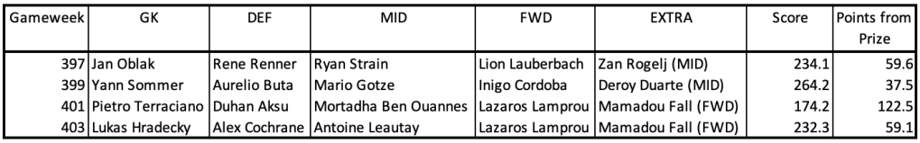 Overall, not what I was hoping for in the first month of this challenge. In the four weekend game weeks I’ve entered so far, the closest I’ve came to a prize is 37.5 points away!
