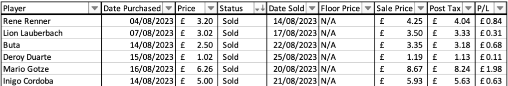 Over the first couple of weeks of the season I did a pretty good job at moving cards on quickly. It was boosted a bit by my line-ups being obviously dead quite early on which lead to me cancelling them to sell during the gameweeks. From the 6 cards I have sold, I’ve brought in a profit of £4.55 which helps to offset some of the cards I’m still holding. One thing to consider is that I’ve only sold at profit so far – in some cases I maybe should have taken a loss to move other cards out of the gallery quicker. Definitely something to bear in mind over the next few weeks.