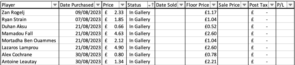 Currently my gallery consists of 8 cards with a combined floor price of £11.96, down £6.67 from when I purchased them. It’s not exactly in the spirit of playing Cap 220 as a DFS game to hold players this long, but for the most part they have been listed for sale. If I’d done better at picking players that perform well, I’d have been able to move them on a bit easier – so in a lot of ways my failings above cause these issues. I do have the back-up option of packaging cards to a trader if needed but I will keep trying to move them on the market for the time being.