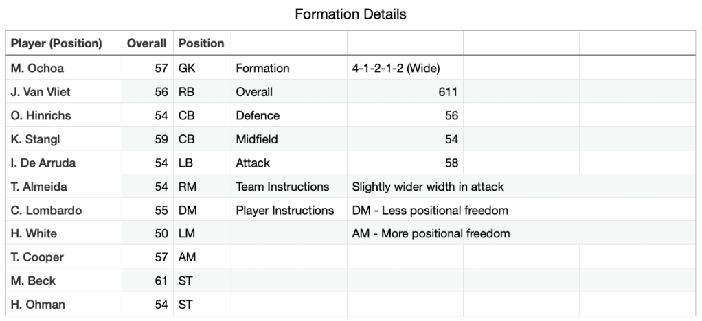 There’s a couple of new signings in the XI; Martin Beck is a pacey striker with decent finishing. I targeted adding some real speed upfront after the Redemption Cup games and hopefully Beck will be a big improvement on last seasons forwards.