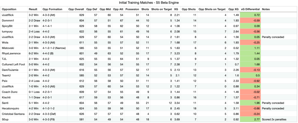 For the first set of testing, I have played 20 training matches using the latest beta match engine, which should be the live engine for season 5. This has allowed me to complete the testing using a couple of new players I purchased before Rollover Day. The aim for the initial tests is to get a general feel for the tactics against a variety of formations. Hopefully it will identify whether the tactics need a complete overhaul and identify where to focus further testing.