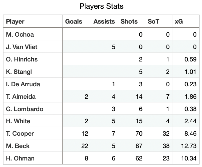 The xG is primarily being generated by the two forwards and the attacking midfielder. Each of the three has averaged at least 3 shots and 0.5 xG per game. Martin Beck’s performance looks like a massive outlier from this data – having scored 22 goals on just 12.73 xG. Certainly not a sustainable rate!