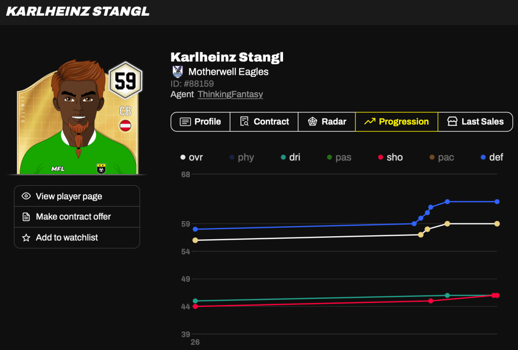 Karlheinz Stangl was the pick of the side in terms of progression over the course of the season. He picked up 5 points of defending and few other points spread out. The net result is he’s gone from 56 to 59 rated playing in 5 of 6 games. Hopefully, this rate of progression will mean he can progress more over season 5. The only downside is his progression has reduced the training XP he will receive.