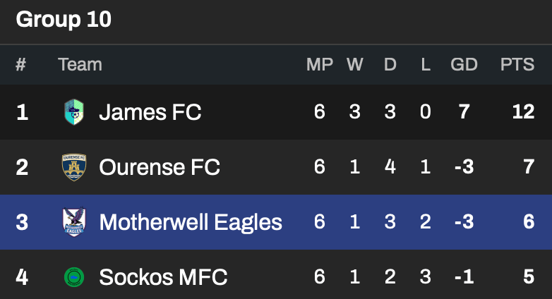 Frustratingly, if we had won the game, we would have came second in the group and qualified for the knockouts. As it is we came 3rd in the group ahead of Sockos FC and have a long wait for season 5 to start.