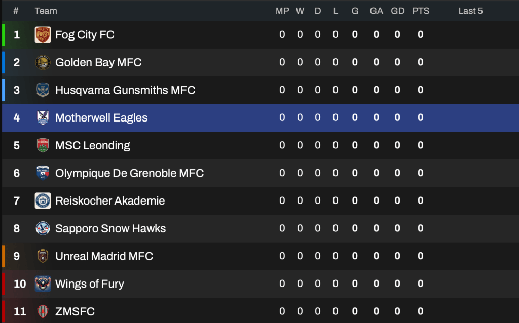 The Motherwell Eagles have been placed into Spark League 90, currently it’s an 11 team division. Interestingly the league contains a San Francisco derby between Fog City FC and Golden Bay MFC! Overall it looks like a league of haves and have nots.