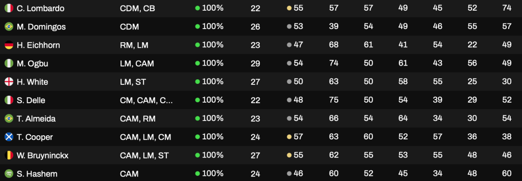 Midfielders – The midfield is pretty full, to give me the option to swap to a five-man midfield if needed. For my standard 4-1-2-1-2 the plan is for Domingos to back-up Lombardo in the defensive midfield role, with Delle being the 3rd choice if we move to a formation with 2 DMs. On the right flank, Almeida will be the starter with Hans Eichhorn being the rotation option.