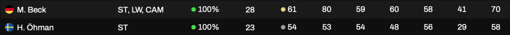 Forwards – Finally, the two dedicated forwards in the side. I’ve got really high hopes for Martin Beck. I signed Beck to bring speed up front after seeing how deadly speed was against me in the Redemption Cup. The early results in testing have been really promising, hopefully it translates into competitive games!