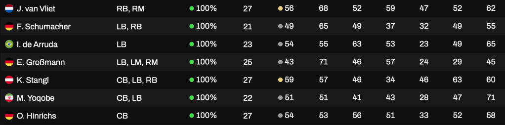 Defenders – I’m running pretty light at centre-back with Mahmoud Yoqobe being the primary back-up for both starters. For the full backs I have slightly more depth, but I’ll be looking to run a three man rotation again with new signing Franz-Josef Schumacher being the primary back-up on both flanks. He’s young and a new mint this season, so I’m hoping I can get some good progression from Schumacher with a decent amount of game time.