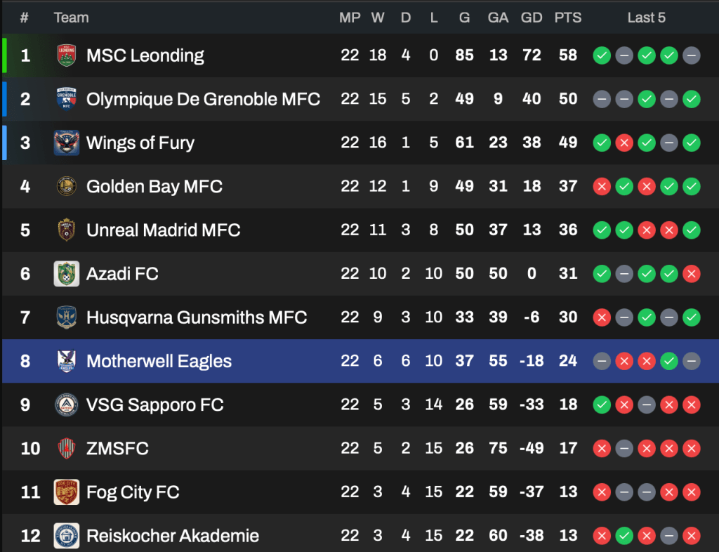 Season 5 was the first full season for the Motherwell Eagles in Spark 90 and I’ve learned a lot over the last 6 weeks. In this article we’ll take a look at how things went on the field and off before we take a look at what lessons we can learn for season 6 and beyond.