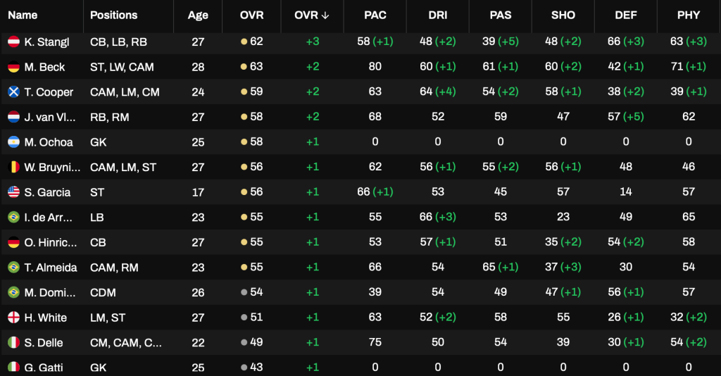 The rest of the starters progressed well for the most part, with Martin Beck and Timmy Cooper also recording multiple overall increases. Perhaps to be expected given those players have earned the most match experience in the squad. Claudio Lombardo and Henrik Ohman were the two outliers among the starters in not gaining any overall increases, but at 22 and 23 there’s still some hope of progression to come.