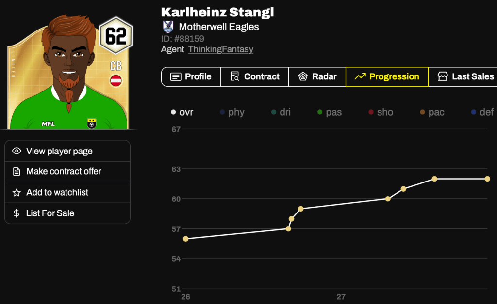 Karlheinz Stangl was the pick of the bunch going up 3 overall this season. He has picked up some stat increases since his last overall change so he’s got at least one more point of potential available. Stangl has been best purchase on MFL progression-wise, I picked him up off the market as a brand new 56 rated player before the Redemption Cup last year. He turns 28 next year so hopefully he can avoid relegation for a few more years and continue to progress nicely.