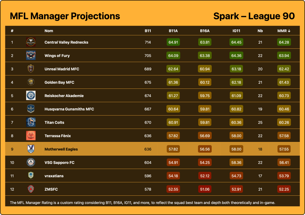 The Motherwell Eagles look to be in a three way battle for 8th place based on the projections. We’re really evenly matched with Terrassa Fenix and VSG Sapporo FC in terms of our in game starting XIs. Sapporo trail a little bit in their squad depth, but both will be tough competitors this year!