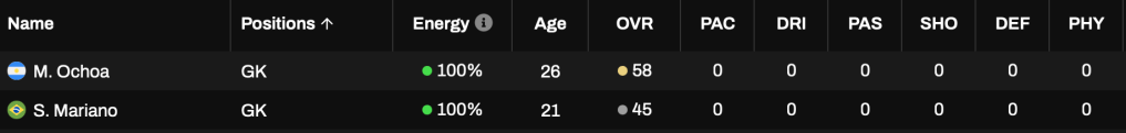 In goal Mariano Ochoa remains the starter and should get the vast majority of games. I’ve actually downgraded at the backup spot for this season. Rex Brennan has moved to Tabasco Fire to be the starter there. So Sidnei Mariano comes into the squad to be the new back-up for the Eagles. I picked him up from a reward pack and unfortunately he’s way below the level needed to start. He is at least young so hopefully he can grow into a useful player.