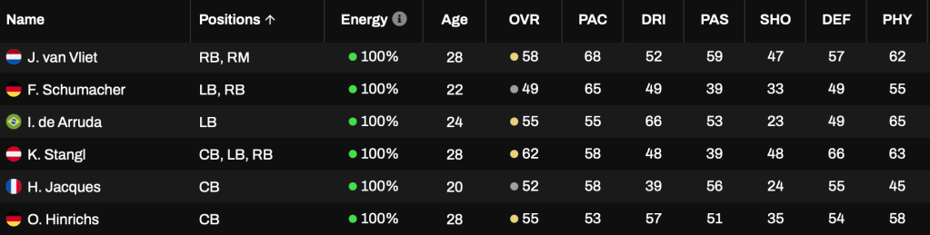 The defence is exactly the same as it was last season, with three man rotations in the centre and at the full back positions. The defence is pretty old overall, so I’m hoping Jacques, de Arruda and Schumacher can start showing some strong progression this year otherwise we’ll be in the market for starting level defenders within the next couple of seasons I think.
