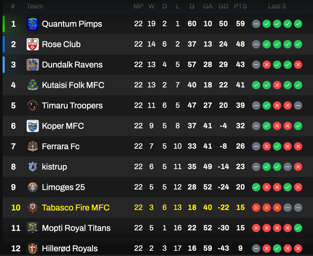 Given the strength of our squad relative to the league, I knew this was going to be a tough season. The target was 10th placed with Hillerod and Limoges both being around our level. We scraped 10th in the end, thanks to late registering Mopti Royal Titans having a single point deduction.