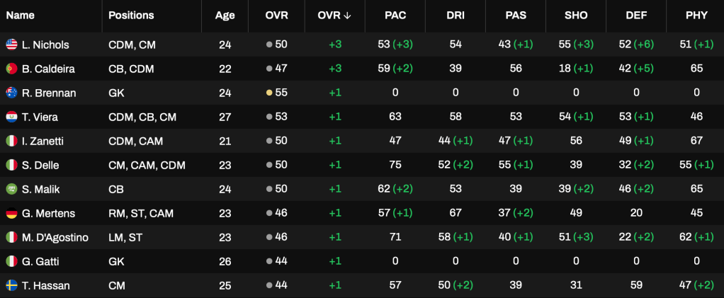 On the plus side, the boosts for my players have come to some of the young starters in the squad. Rex Brennan made the step up to a limited player whilst the Italian duo of Zanetti and Delle have both improved in midfield. As I hopefully move towards a 100% owned squad, it’ll be nice to see the progression kept in my agency rather than taken by the loanees.