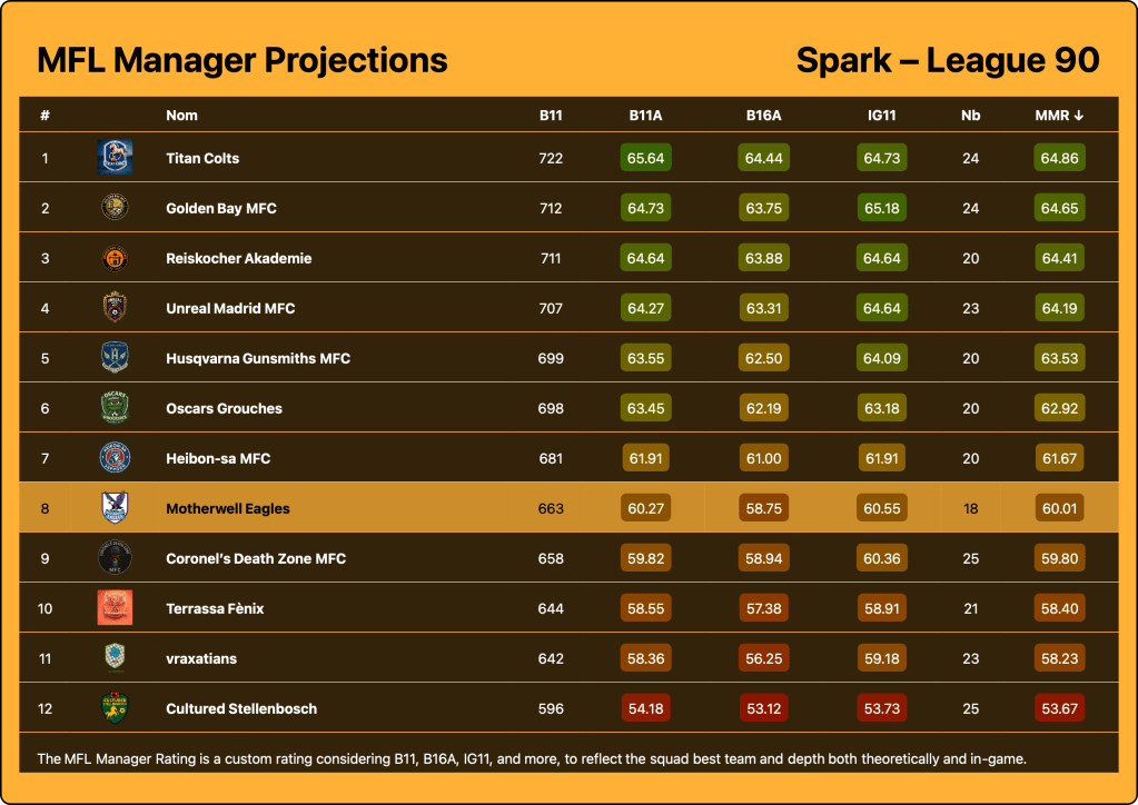 Knock-out Rounds in the Cup – Same as usually, getting out of the group stage and earning a bit of extra MFL will be the goal in the cup. I will be prioritising the Cup games over the league as we aren’t going for promotion this year.