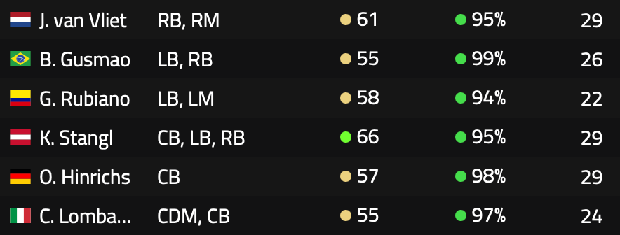 For the full-backs, again the starters from last season return in Jacob van Vliet on the right and Gustavo Rubiano on the left. I have improved the rotation options as Bruno Gusmao comes in to replace Schumacher and is a 6 point upgrade overall.