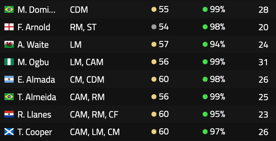The left side of midfield one of the positions I was keen to strengthen going into this season. I was hoping to get a new starter with an overall of 60+. However, I struggled to find a player of a reasonable age in the price range I was looking to pay. I ended up settling on Alexander Waite, a 24 year-old 56 rated LM with solid defending much like Monday Ogbu.