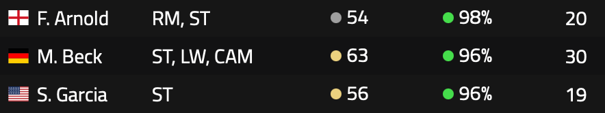 Martin Beck remains the star of the forward line, bringing elite pace alongside solid finishing and physical. At 30 years old, he does need replacing in the at some point but he hasn’t announced his retirement yet at least. Returning alongside Beck is the youngster Shane Garcia. Now 19, Garcia is up to 68 pace and should get plenty of game time to help him progress.