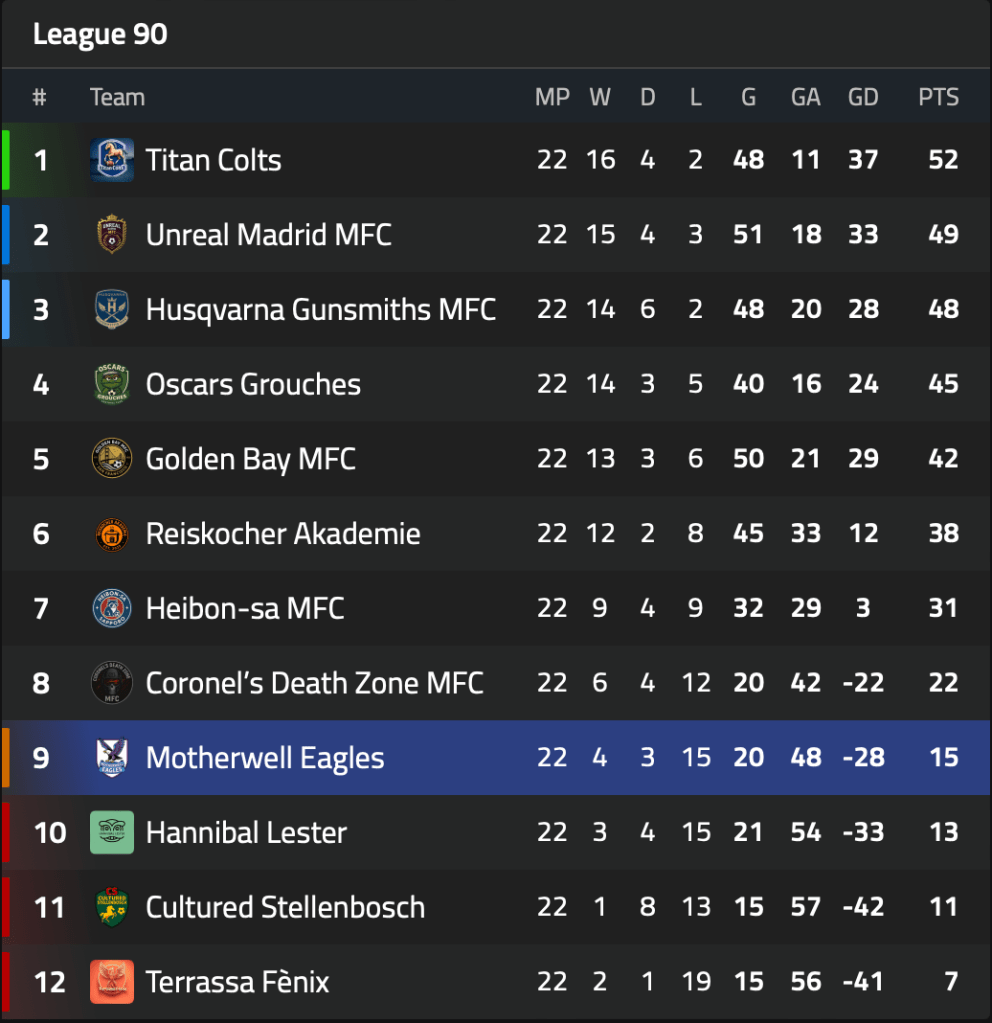The league campaign got enough to strong start. We managed to take advantage of a weak opening schedule to take 7 points from the opening four games. The results dropped off a bit towards the midseason break, but we still ended up in 9th place two points behind 7th. The not the best set of results, but a start I was hoping I could build on after the midseason break