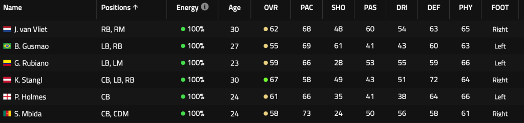 In defence the full backs remain the same as last season, van Vliet starts on the right, Rubiano on the left with Gusmao being the rotation option for both. Our star defender Karlheinz Stangl returns in the centre of defence, but he’ll have different partners this season. I wanted to get younger than last seasons pair of 29 year-old starters as well as adding some more pace.