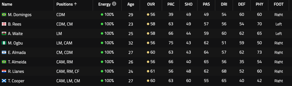 In the midfield there’s an addition defensive midfielder to allow us to play the 4-2-3-1 consistently. Brian Rees is another younger player with a history of progression, +4 over 3 seasons including a tier break and will start alongside Edgardo Alameda. Alex Waite and Rodrigo Llanes remain the starters on either flank and another two I’m hoping to see improve.