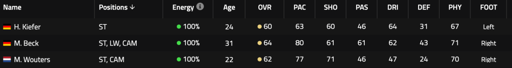 Finally, the forwards. Our star forward Martin Beck returns again, but he will be moving back into the CAM role for this season. He’s a really solid all rounder and 62 rated at the position making him the best in the squad at the position.