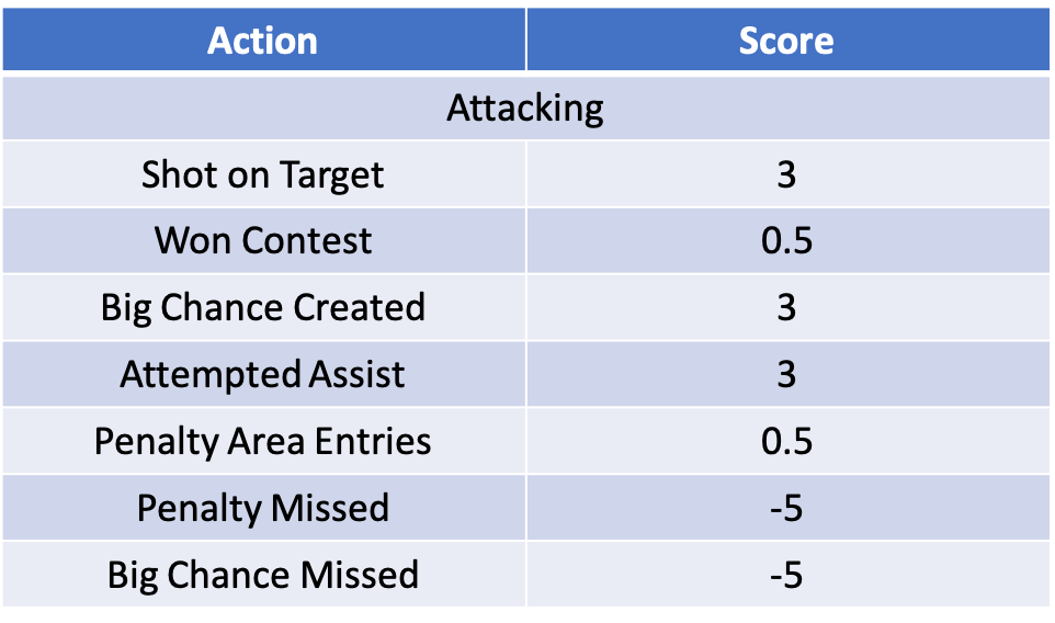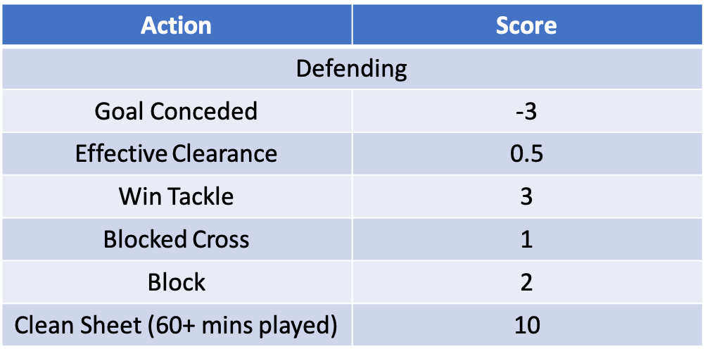 Beyond conceding goals, the rest of the defensive category is unsurprisingly filled with actions that disrupt the opposition. An effective clearance comes in at the lowest score of the actions. Blocking a shot rewards double that of a cross, which favours central defenders over wide defenders. Finally a tackle earns the most outside of a clean sheet at 3 points.