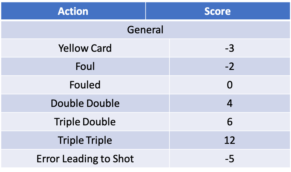 The General category includes some high value categories, both positive and negative. The negatives come in the form of fouls, yellow cards and errors leading to shots all of which can have a big impact on a players AA score. On the positive side, players can earn the NBA inspired doubles and triples – also a big impact on AA scores!